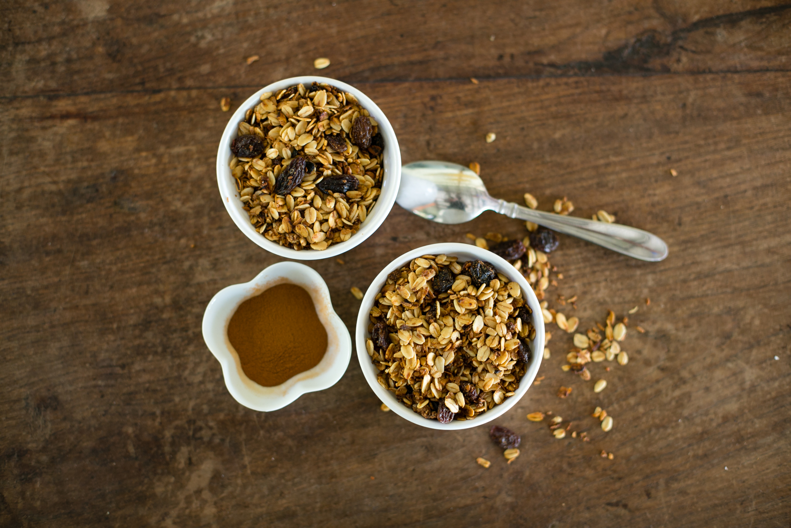 Granola, Yogurt, Bananas/Apples, Fried Eggs on Wilted Fresh Spinach